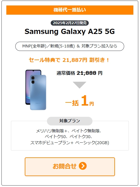 Samsung Galaxy A25 5G | MNP(全年齢)新規(5-18歳) | メリハリ無制限+ ペイトク無制限 ペイトク50 ペイトク30 スマホデビュープラン+ ベーシック(20GB) | 21,888円 | ▲21,887円 | 1円 |