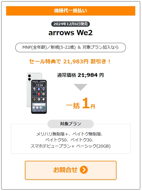 arrows We2 | MNP(全年齢)新規(5-22歳) | メリハリ無制限+ ペイトク無制限 ペイトク50 ペイトク30 スマホデビュープラン+ ベーシック(20GB) | 21,983円 | ▲21,983円 | 1円 |