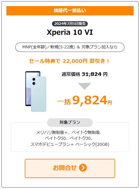 Xperia 10 VI | MNP(全年齢)新規(5-22歳) | メリハリ無制限+ ペイトク無制限 ペイトク50 ペイトク30 スマホデビュープラン+ ベーシック(20GB) | 31,824円 | ▲22,000円 | 9,824円 |