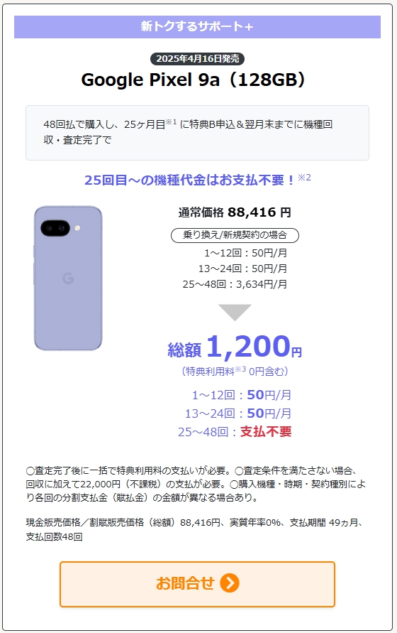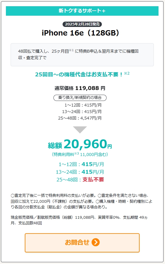 iPhone 16e 128GB | 48回払いで購入25ケ月目までに返却 | 119,088円 | 415円/月 X24回 | 9,960円 |
