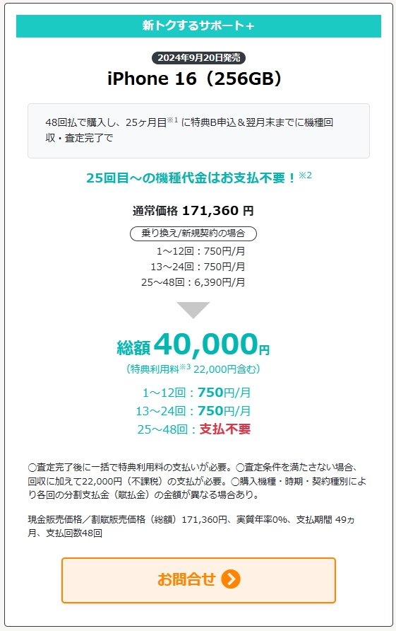 iPhone 16 256GB | 48回払いで購入25ケ月目までに返却 | 171,360円 | 750円/月 X24回 | 18,000円 |