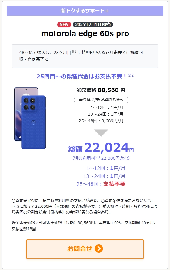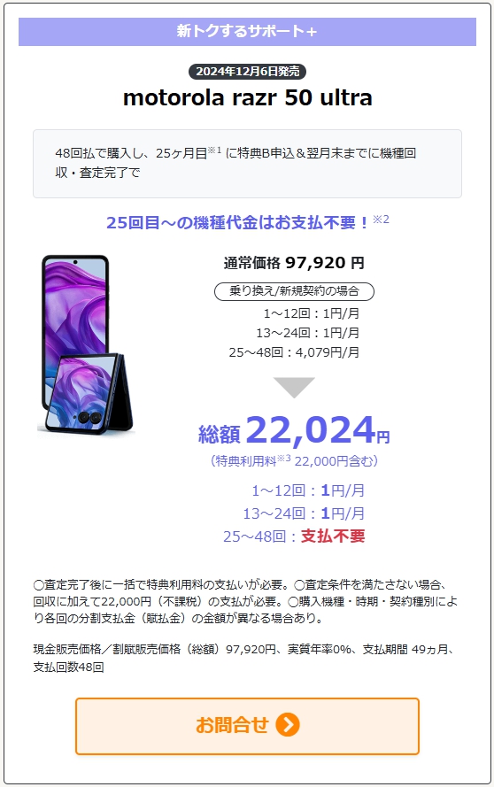 「新トクするサポート+」とは、ソフトバンク株式会社が提供する、高額なスマートフォンの購入をサポートするための端末購入サポートプログラムです。対象機種を48回払いで購入し、13ヶ月目または25ヶ月目以降に特典利用を申し込むと、ソフトバンクが端末を回収・査定した後、特典利用料を支払うことで残りの分割支払金・賦払金が不要になる仕組みです。これにより、ユーザーは比較的少ない負担で定期的に最新機種へ買い替えることができます♪