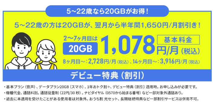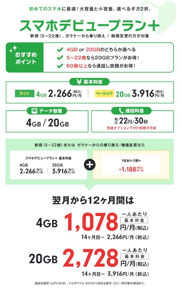- 2020年9月16日以降の新規契約において「データプラン 4GB(スマホ)」「データプラン 20GB(スマホ)」「データプラン 4GB(ケータイ)」「データプラン 3GB(スマホ)」又は「データプラン 3GB(ケータイ)」に加入した際の使用者として指定されたことがある方を、再度使用者として新規契約で「スマホデビュープラン+」に加入することはできません。