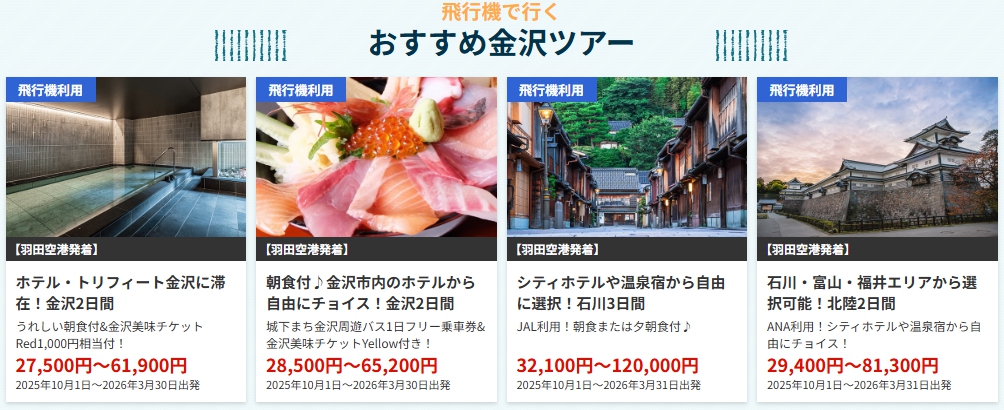 1.羽田空港→小松空港 便数が多く、金沢・加賀へなら小松便を。