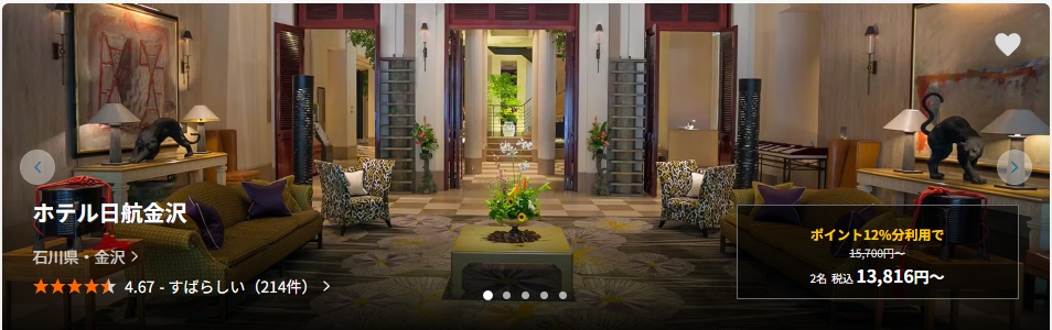 金沢城の隣に位置するホテルは、その豪華なインテリアデザインで訪れる人々をタイムスリップさせます。807m地下から汲み上げる天然温泉はお肌に優しく、疲れた身体を癒します。各客室は細部までこだわりが見られ、特別な空間を作り上げています。そして、金沢の四季を味わう食事は、旬の食材と料理長の技が紡ぎ出す一品。さらに、日本庭園の風景を眺めながら過ごす時間は格別です。美しさと癒しを求める方には最適な場所と言えます。