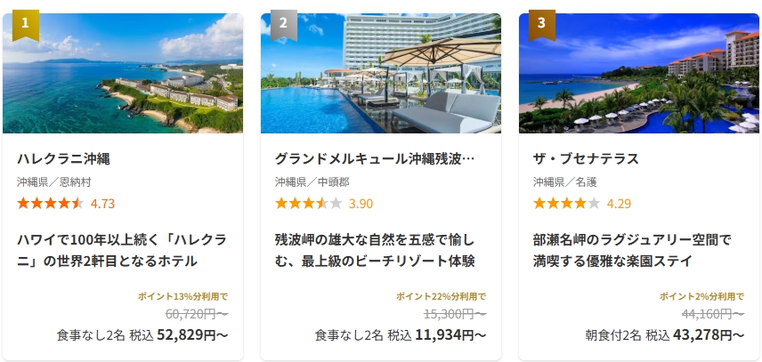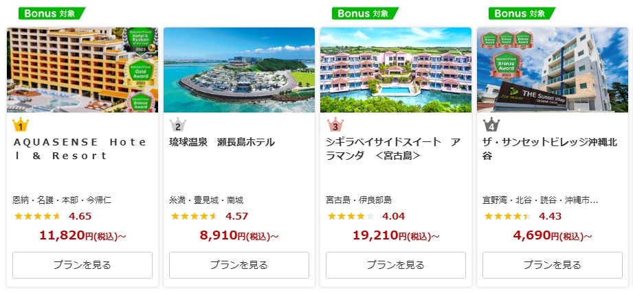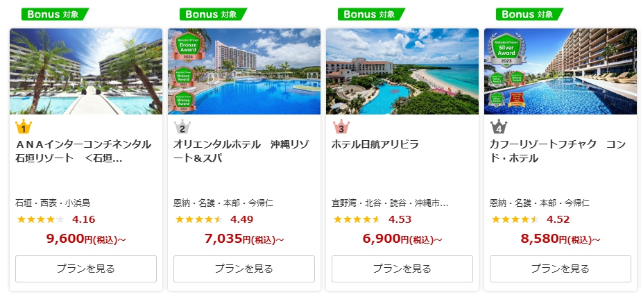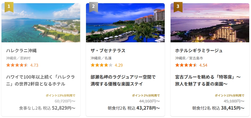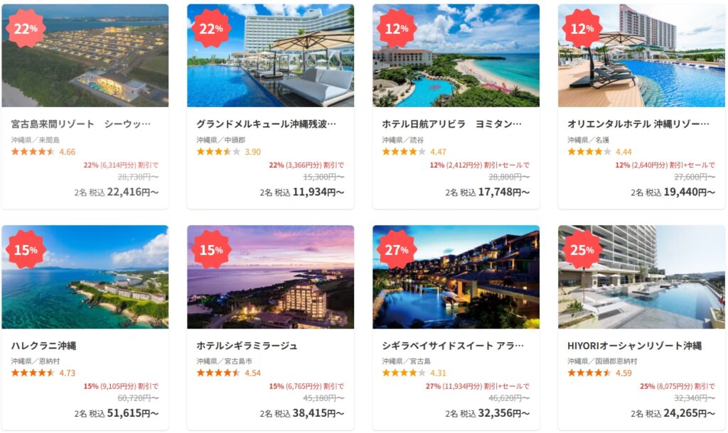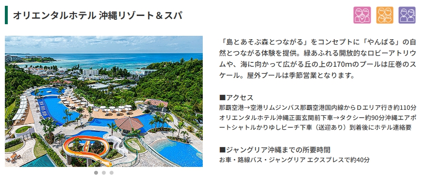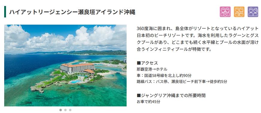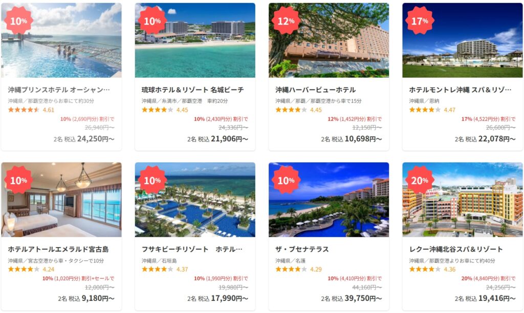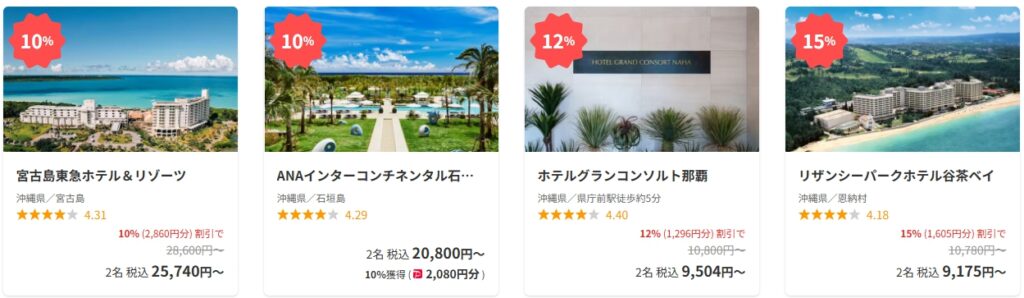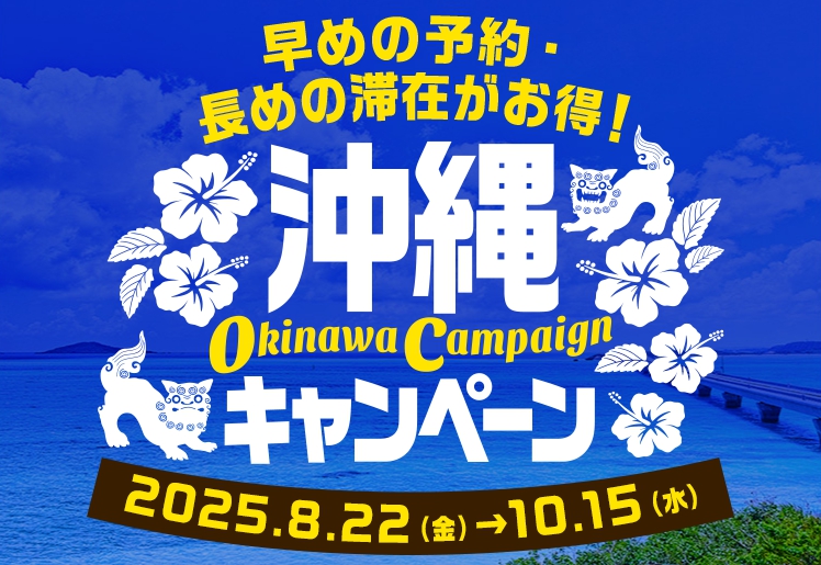 対象ホテル:オリエンタルホテル 沖縄リゾート&スパ、オリオンホテル モトブ リゾート&スパ、ホテルモントレ沖縄スパ&リゾート、ヒルトン沖縄瀬底リゾート、ホテル日航アリビラ、沖縄かりゆしビーチリゾート・オーシャンスパ、ルネッサンスリゾート オキナワ、リザンシーパークホテル谷茶ベイ、ANAインターコンチネンタル万座ビーチリゾート、グランドメルキュール沖縄残波岬リゾート、OKINAWA KARIYUSHI RESORT EXES ONNA、ヒルトン沖縄宮古島リゾート、HIYORIオーシャンリゾート沖縄、サザンビーチホテル&リゾート沖縄、ダブルツリーbyヒルトン那覇首里城、ヒルトン沖縄北谷リゾート、ココ ガーデンリゾート オキナワ、ダブルツリーbyヒルトン沖縄北谷リゾート