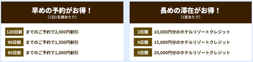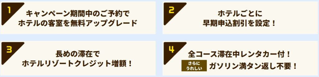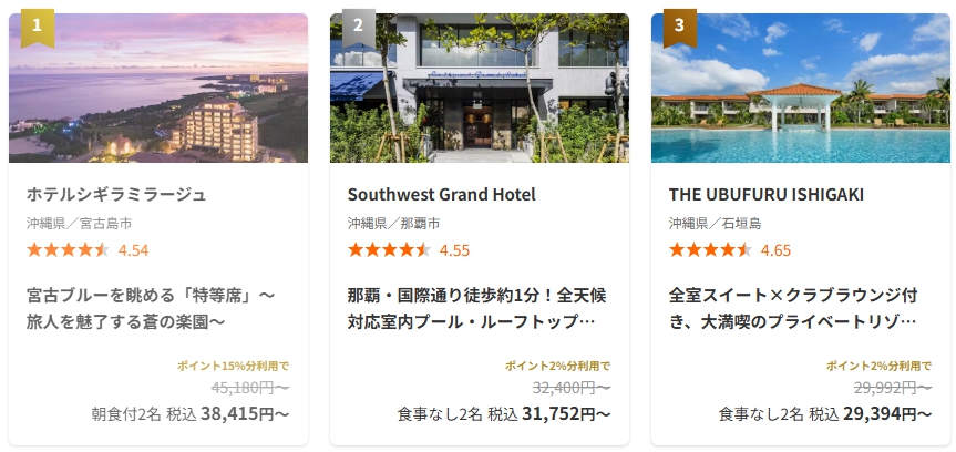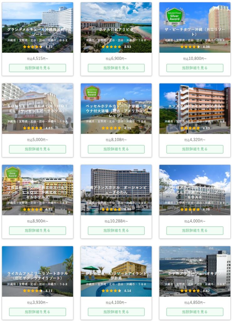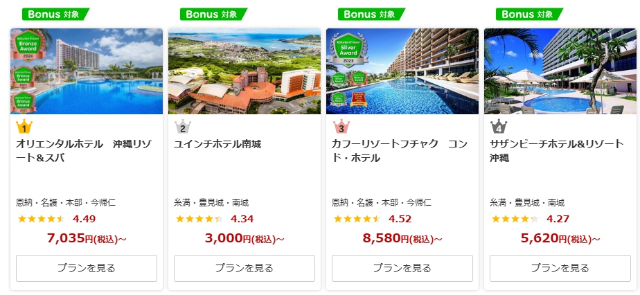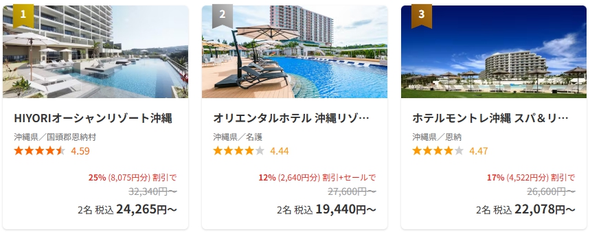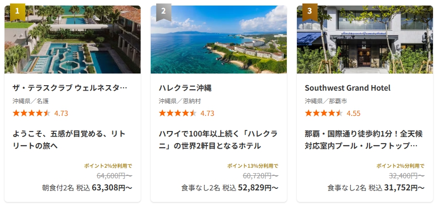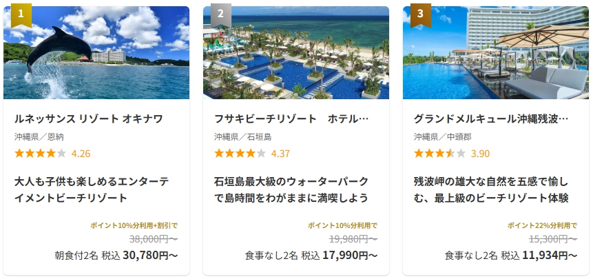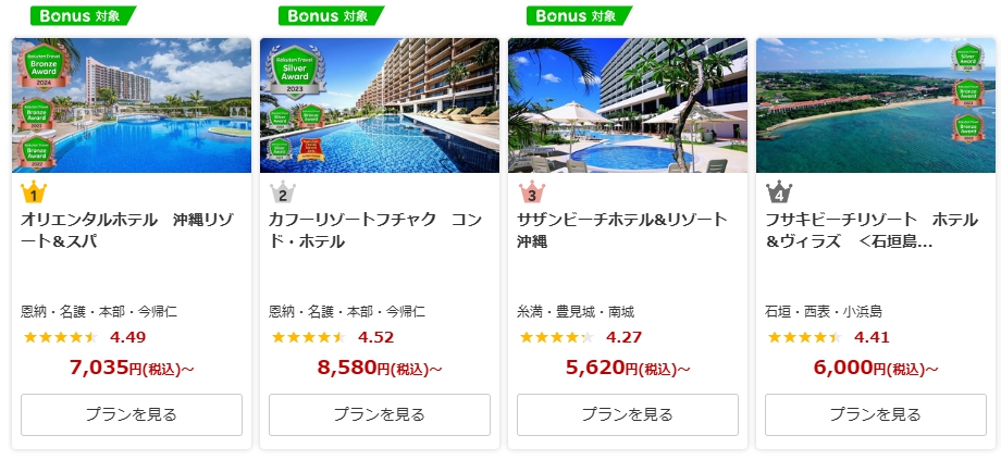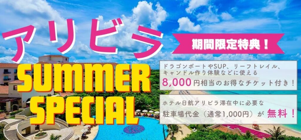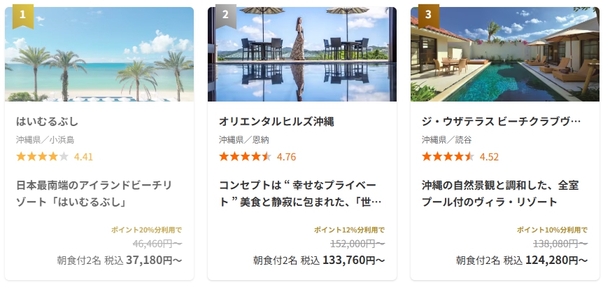 対象ホテル:オリエンタルホテル 沖縄リゾート&スパ、オリオンホテル モトブ リゾート&スパ、ホテルモントレ沖縄スパ&リゾート、ヒルトン沖縄瀬底リゾート、ホテル日航アリビラ、沖縄かりゆしビーチリゾート・オーシャンスパ、ルネッサンスリゾート オキナワ、リザンシーパークホテル谷茶ベイ、ANAインターコンチネンタル万座ビーチリゾート、グランドメルキュール沖縄残波岬リゾート、OKINAWA KARIYUSHI RESORT EXES ONNA、ヒルトン沖縄宮古島リゾート、HIYORIオーシャンリゾート沖縄、サザンビーチホテル&リゾート沖縄、ダブルツリーbyヒルトン那覇首里城、ヒルトン沖縄北谷リゾート、ココ ガーデンリゾート オキナワ、ダブルツリーbyヒルトン沖縄北谷リゾート