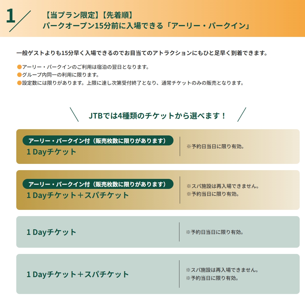 チケット利用日はアーリー・パークイン付は宿泊の翌日となり、通常チケットは宿泊の当日または翌日からお選びいただけます。