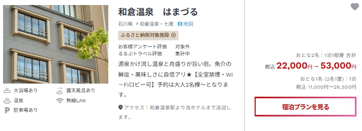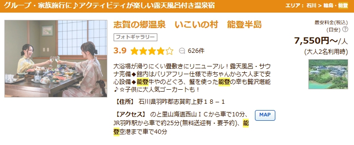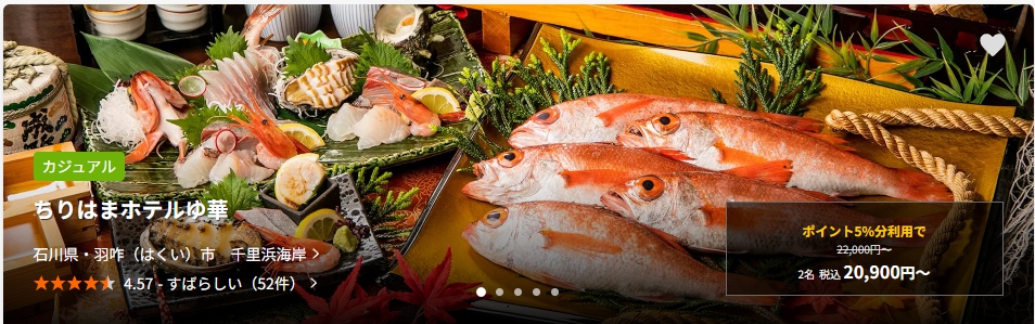 清潔感あふれる館内と能登の豊かな自然に囲まれたホテルは、家族連れに大人気です。敷地内にはゴーカートコースやグラウンドゴルフコースなどのアクティビティ施設があり、体を動かした後は温泉と美味しい夕食を楽しめます。客室は和室が多く、Wi-Fiも利用可能。日本海でとれるお魚を中心にしたバランスの良い会席膳と、肌に優しい温泉で、心地よい滞在をお約束します。
