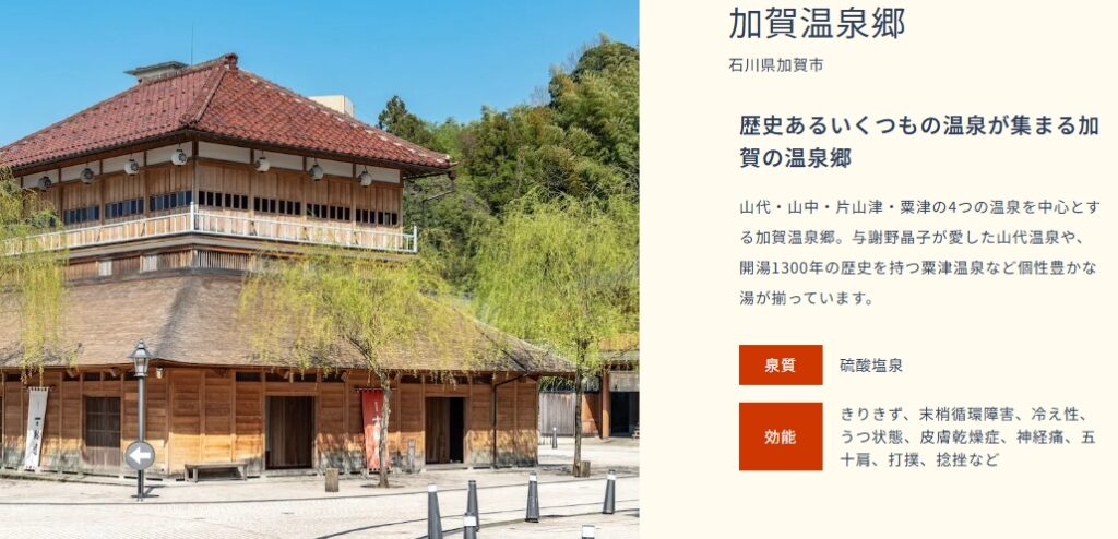 加賀は、 北陸屈指の温泉郷 上質なおもてなしと、湯のまち散策 加賀温泉郷は山代・山中・片山津・粟津という 4湯からなる北陸屈指の温泉エリアです。 九谷焼ゆかりの「山代温泉」 渓谷と清流に隣する「山中温泉」 湖畔のリゾート「片山津温泉」 北陸最古の古湯を誇る山あいの「粟津温泉」と 個性豊かなラインナップで、 どこの湯へ入るかを考えるのも楽しいです。 重要文化財が多数残る「那谷寺」があるのもこのエリア。 山水画のような美しい景色や紅葉狩りを楽しめる名刹です。
