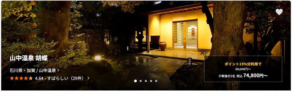 山中温泉のちょっと贅沢な小さな宿。豊な木々と書院造りの建物。 加賀懐石ベースの創作 料理は九谷焼で供される。 和風の本当の良さを求め、心の落ちつきを呼ぶ宿、山中温泉 胡蝶。 ちょっと贅沢なご気分を味わって頂く趣向と心くばりを随所に配した日本が香る風流どころ。