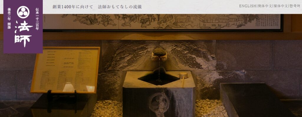 開湯 養老二年(718年)。法師は一千三百年に渡り、みなさまから愛され、そして磨かれてまいりました。代々の伝統と格式を守りながら新しい時の流れに即したおもてなしでお客様をお迎えする法師に、どうか末永くご愛顧賜りますよう。この年、この月、この日。いま法師がお客さまをお迎えしてするおもてなしは、生涯中この一回の他にはあらず、と一期一会の覚悟でお客さまに尽くします。