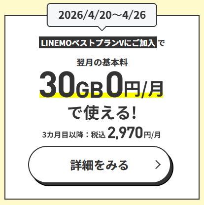 - 対象プラン:ベストプランV(30GB)月額2,970円(税込)