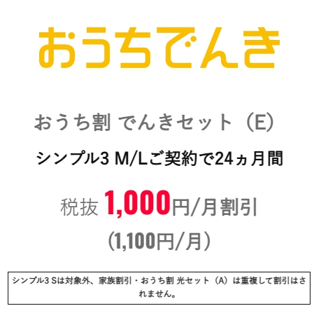 おうち割 電気セット | - | -1,100円 *光セット、家族割との併用は不可 | -1,100円 *光セット、家族割との併用は不可 |