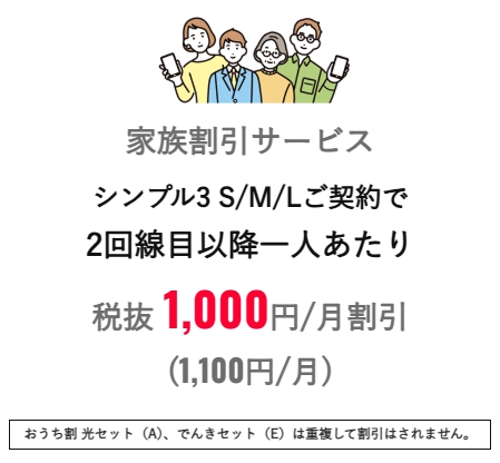 家族割 (2回線目以降) | -1,100円 *光セット、電気セットとの併用は不可 | -1,100円 *光セット、電気セットとの併用は不可 | -1,100円 *光セット、電気セットとの併用は不可 |