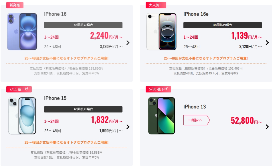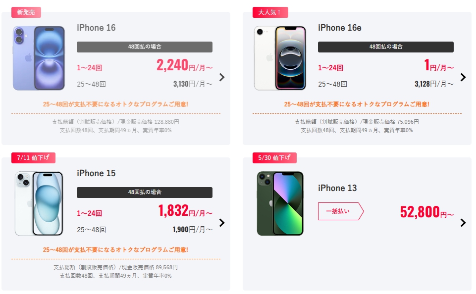 機種は、特典利用の申し込みの翌月末までに当社指定の条件に基づく回収・査定完了が必要です。 査定条件を満たさない場合、機種の回収に加えて22,000円(不課税)の支払いが必要です。 法人契約のお客さまはご利用いただけません。機種・時期によって、1~24回目と25~48回目の分割支払金(賦払金)の金額が異なる場合があります。