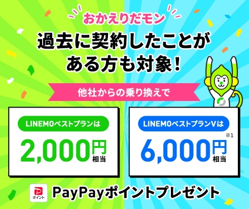 新規なら LINEMOベストプランV :通常6,000円→14,000円相当PayPayポイントプレゼント♪