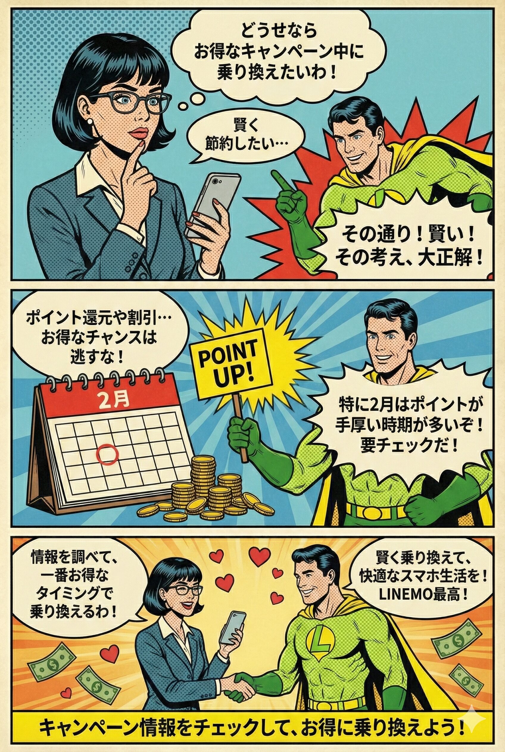 特に2月は、ポイント還元が手厚い時期が多いので要チェック! キャンペーン情報をしっかり調べて、一番お得なタイミングで乗り換えましょう!